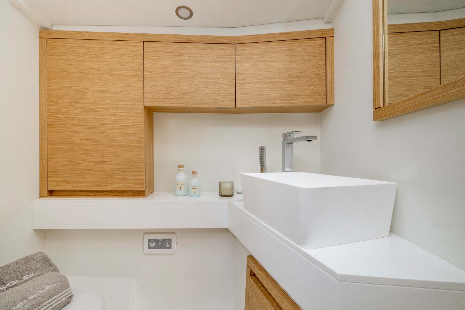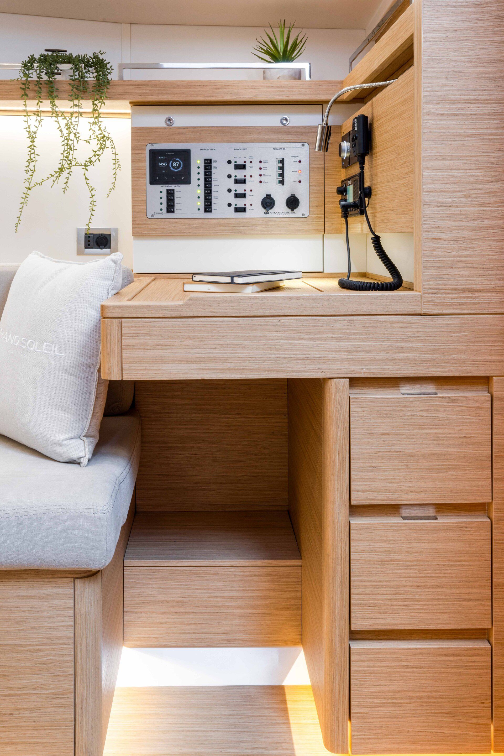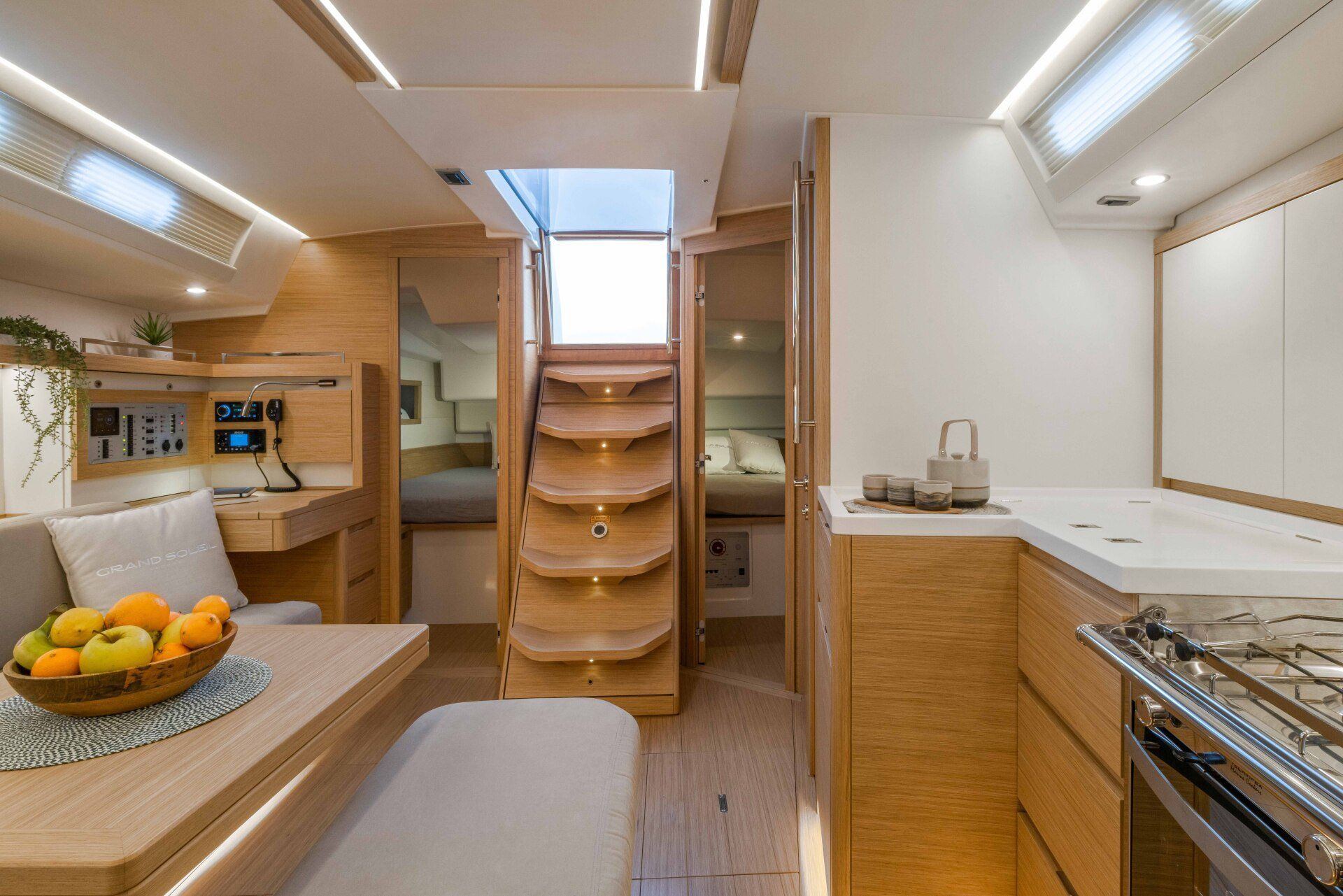 Going below deck you enter a luxurious and fresh space, always functional in its details. Wide, practical, efficient interiors both for cruising use and for moving with agility during regattas. The interior has also been designed to maximize the space between the living and galley areas. Relaxation and comfort for the owner and their guests when cruising can also meet the needs of the regatta sailors.