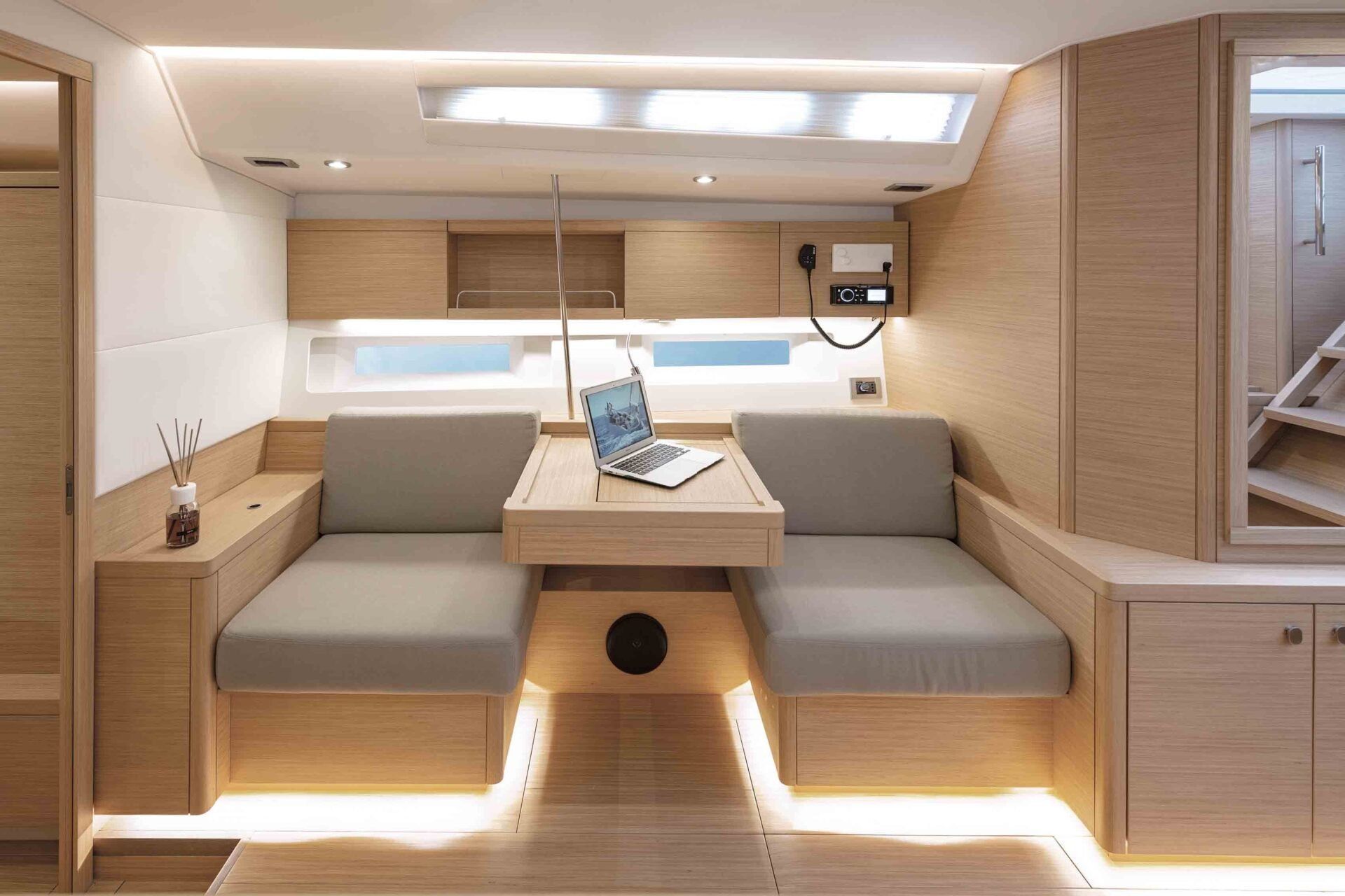 The interior layout is available with two or three cabins, to meet the client’s needs. Both versions include two heads with a shower. In the salon, a three seated sofa Is found on starboard side, while the central seat can be transformed into a chart table. The L-shape galley is equipped with a main fridge and an optional second one, as well as many storage areas.